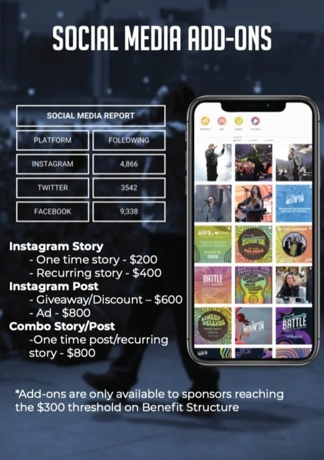 Goal: “Fill The Field” on Festival Day by creating a brand packet to send to potential sponsorship partners to showcase what Movin’ On is, the Benefit Structure options for sponsorship deals, and some of the past sponsors on the field.